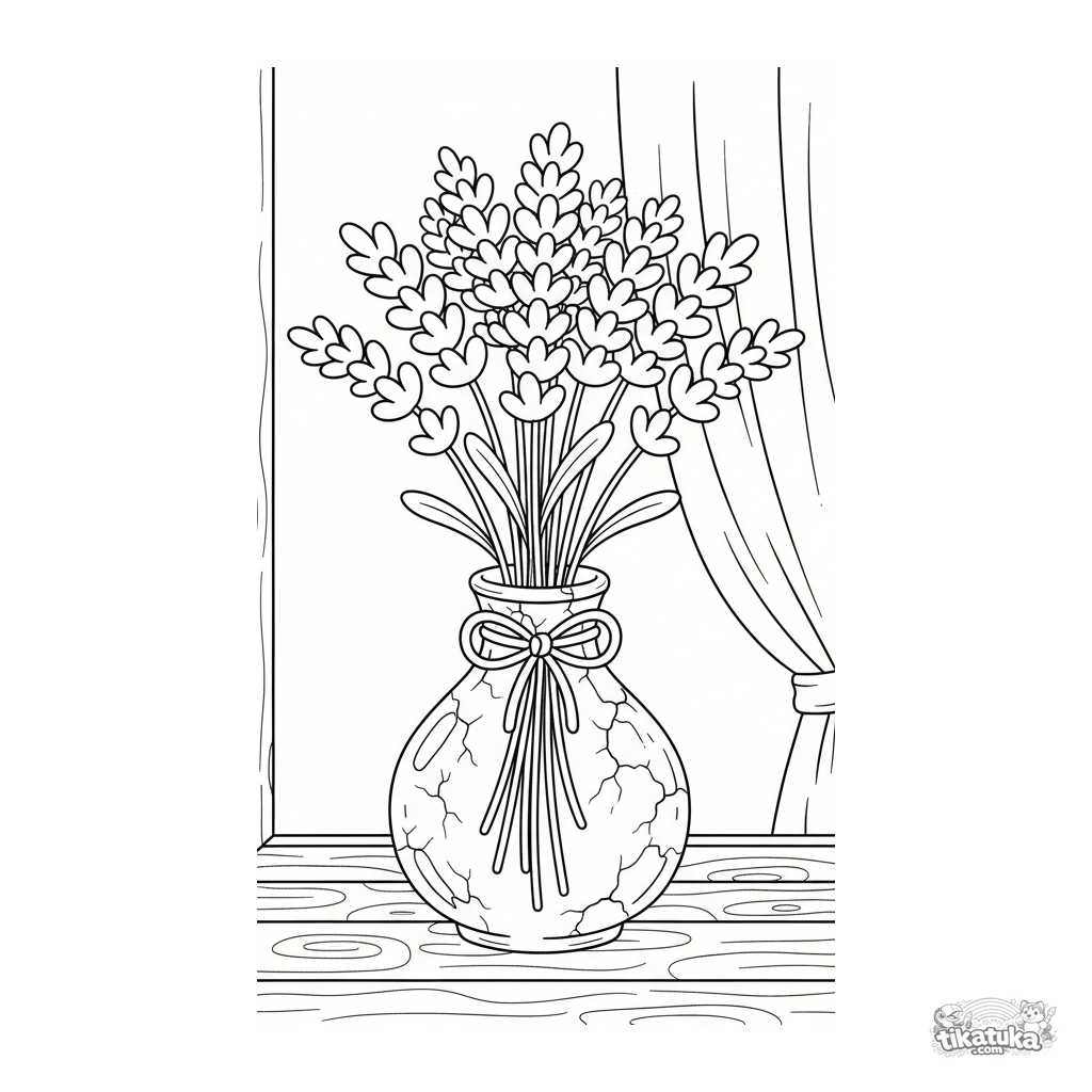 Página para colorir para pré-adolescentes 7-9: um buquê de lavanda em vaso de cerâmica em um parapeito ensolarado. Detalhes moderados, cena aconchegante.