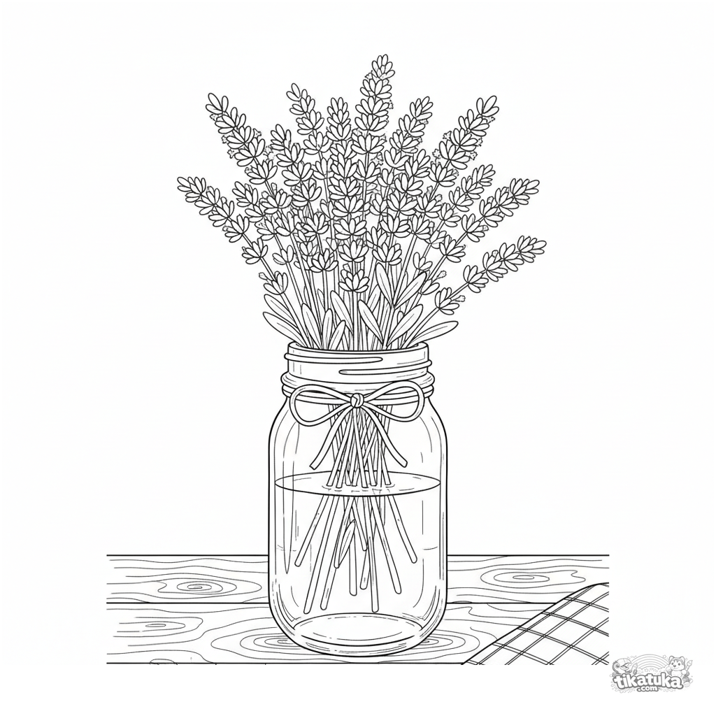 Página intrincada para colorir para 10-12 anos: uma natureza morta realista de um buquê de lavanda em um pote. Alto nível de detalhe.