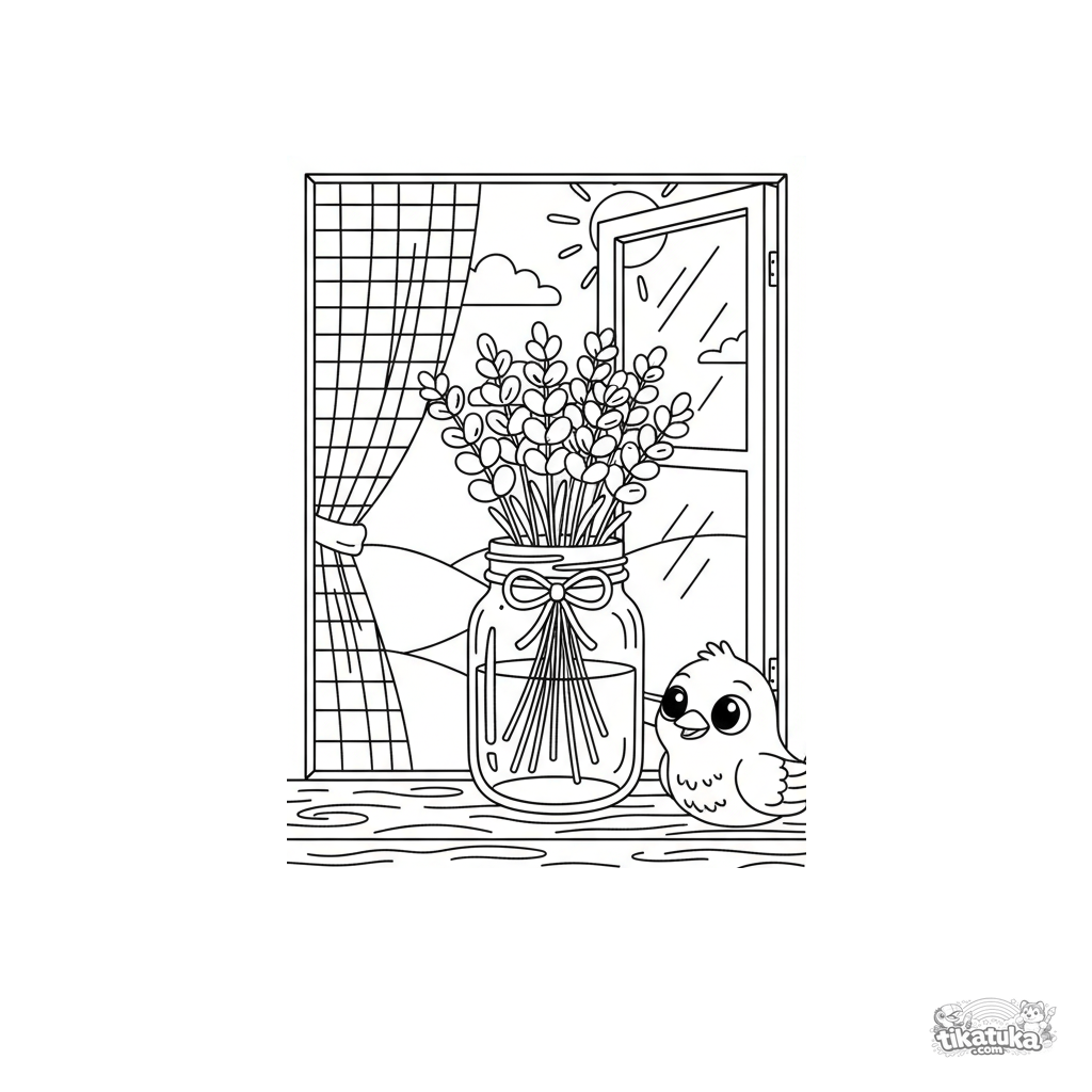 Página para colorir para crianças de 7-9 anos: um buquê de lavanda num pote de vidro num parapeito de madeira. Amarrado com barbante, cortina visível, cena aconchegante com detalhe moderado.