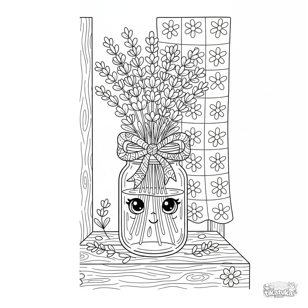 Página para colorir para crianças de 10 a 12 anos: um buquê de lavanda em um pote em um parapeito de madeira. Cena detalhada e aconchegante.