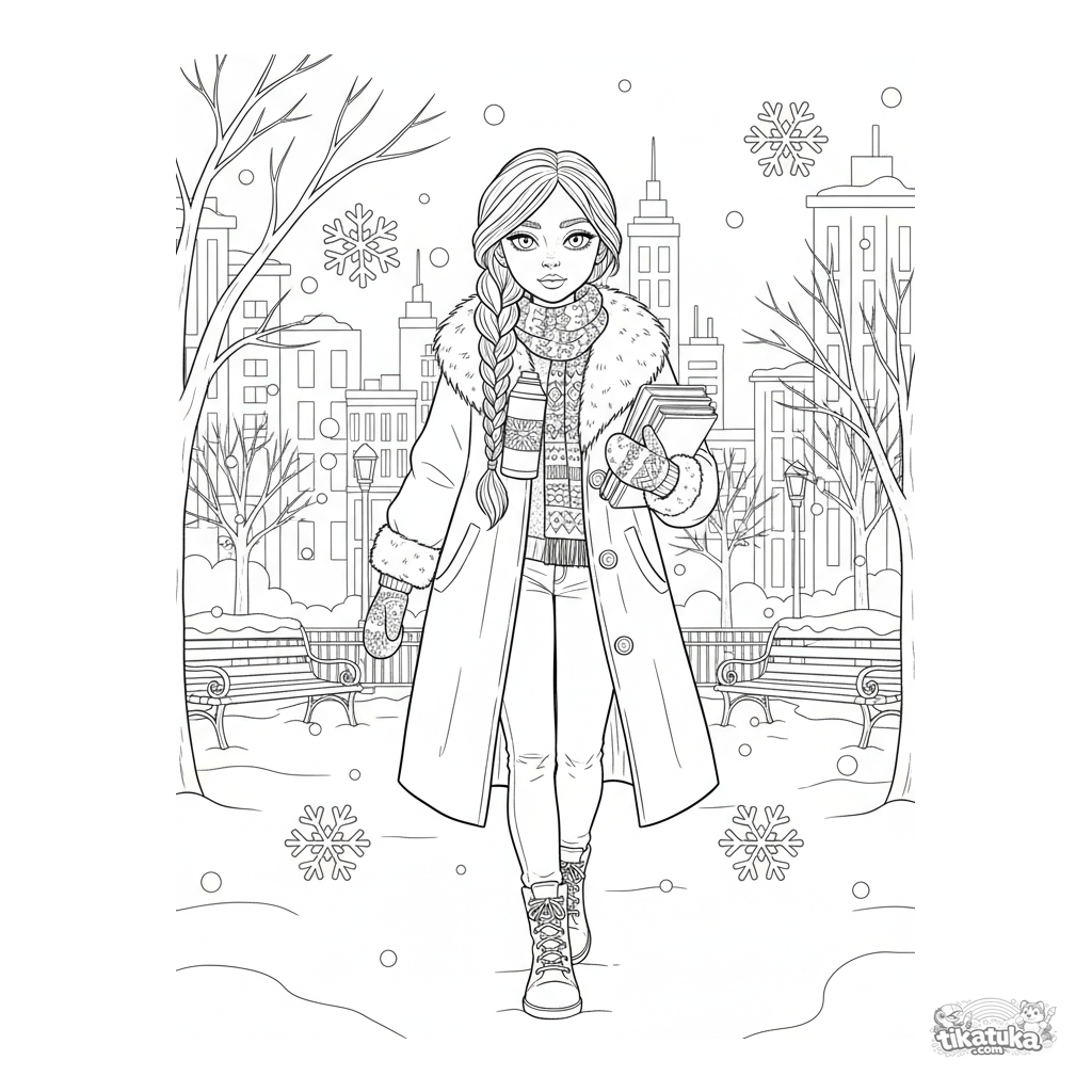 Página para colorir detalhada para 10-12 anos: traje de inverno em camadas em um parque nevado. Uma garota de casaco, cachecol, com livros e uma garrafa térmica. Fundo com árvores, bancos e luzes da cidade.