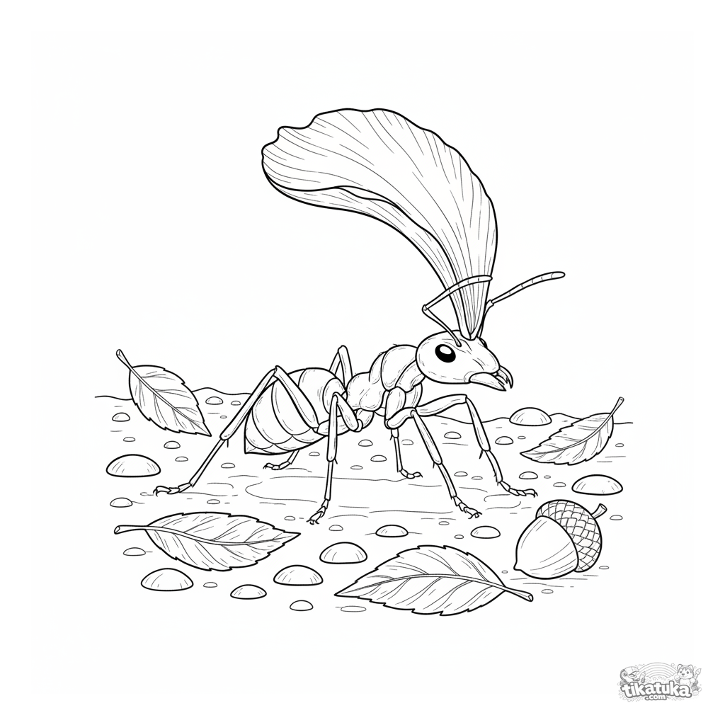 Página detalhada para colorir de uma formiga cortadeira carregando uma grande pétala de flor pelo chão da floresta. Para crianças 7-12 interessadas na natureza.