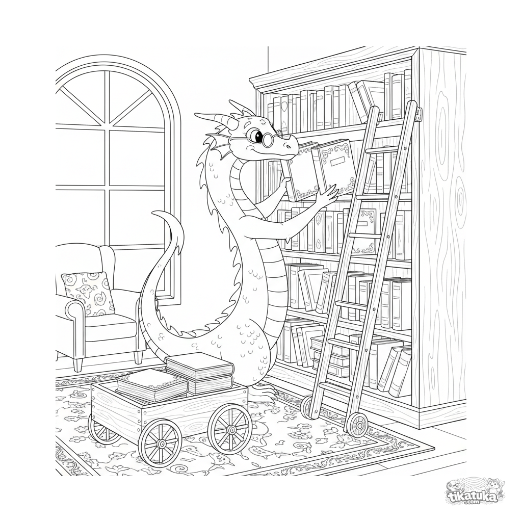 Página para colorir para 10-12 anos: um dragão bibliotecário organizando livros em uma sala de aula. Cena de fantasia detalhada.