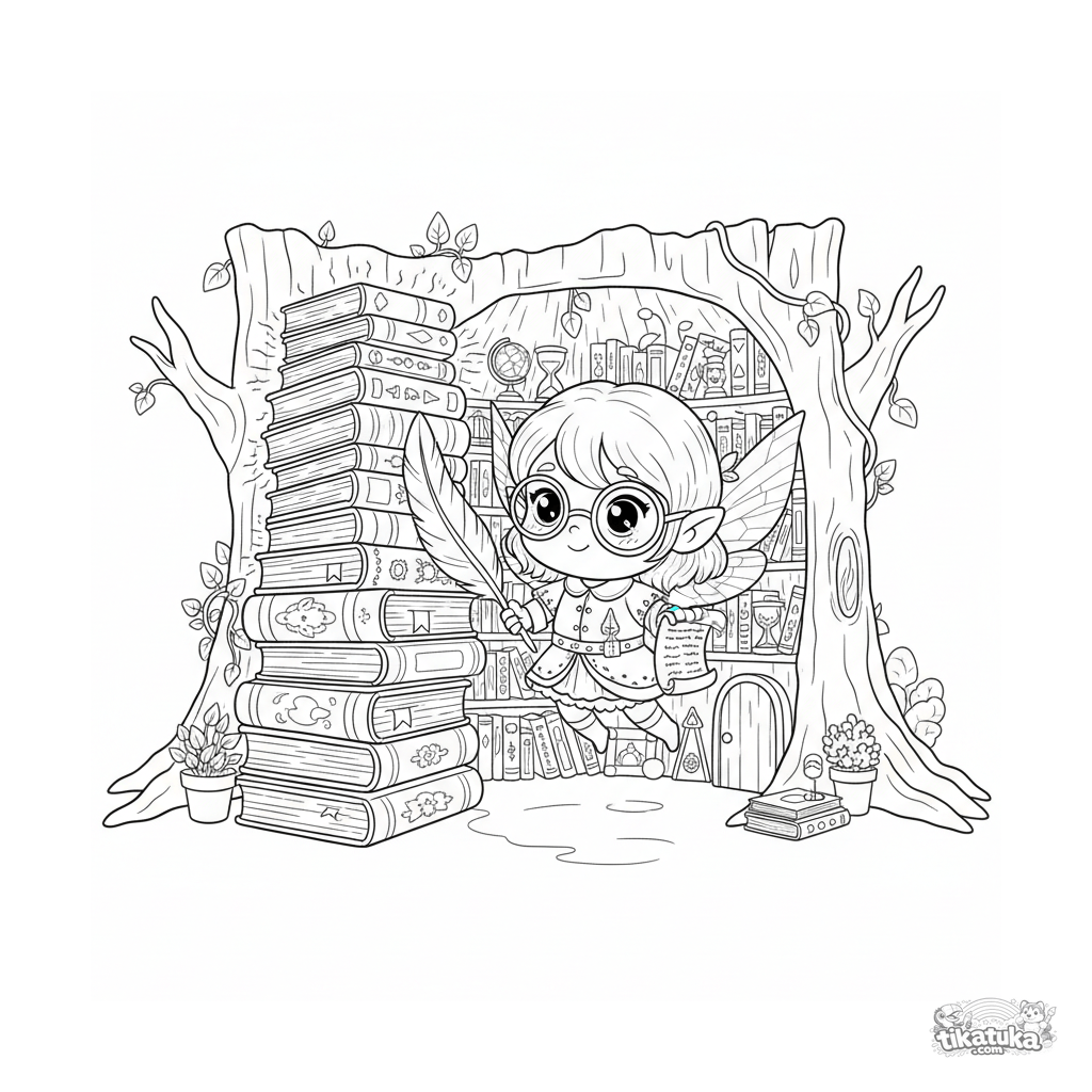 Página para colorir para crianças 10-12: uma fada bibliotecária organiza livros brilhantes em uma biblioteca em miniatura dentro de um toco de árvore. Cena detalhada com muitos elementos, margens amplas para criatividade.