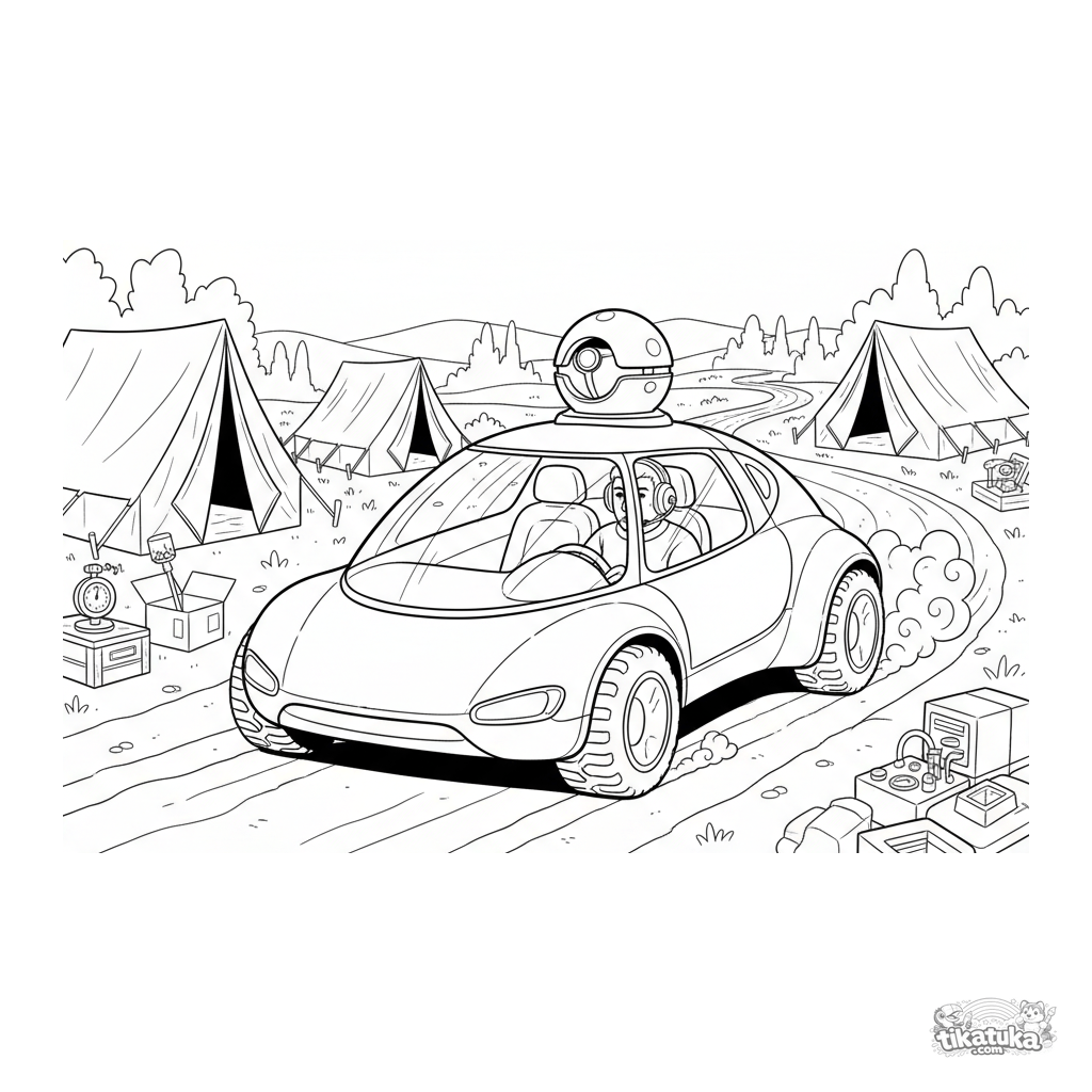 Página para colorir para crianças maiores 10-12: um veículo de reconhecimento leve detalhado em patrulha entre barracas de campo. Motorista com fones visível.