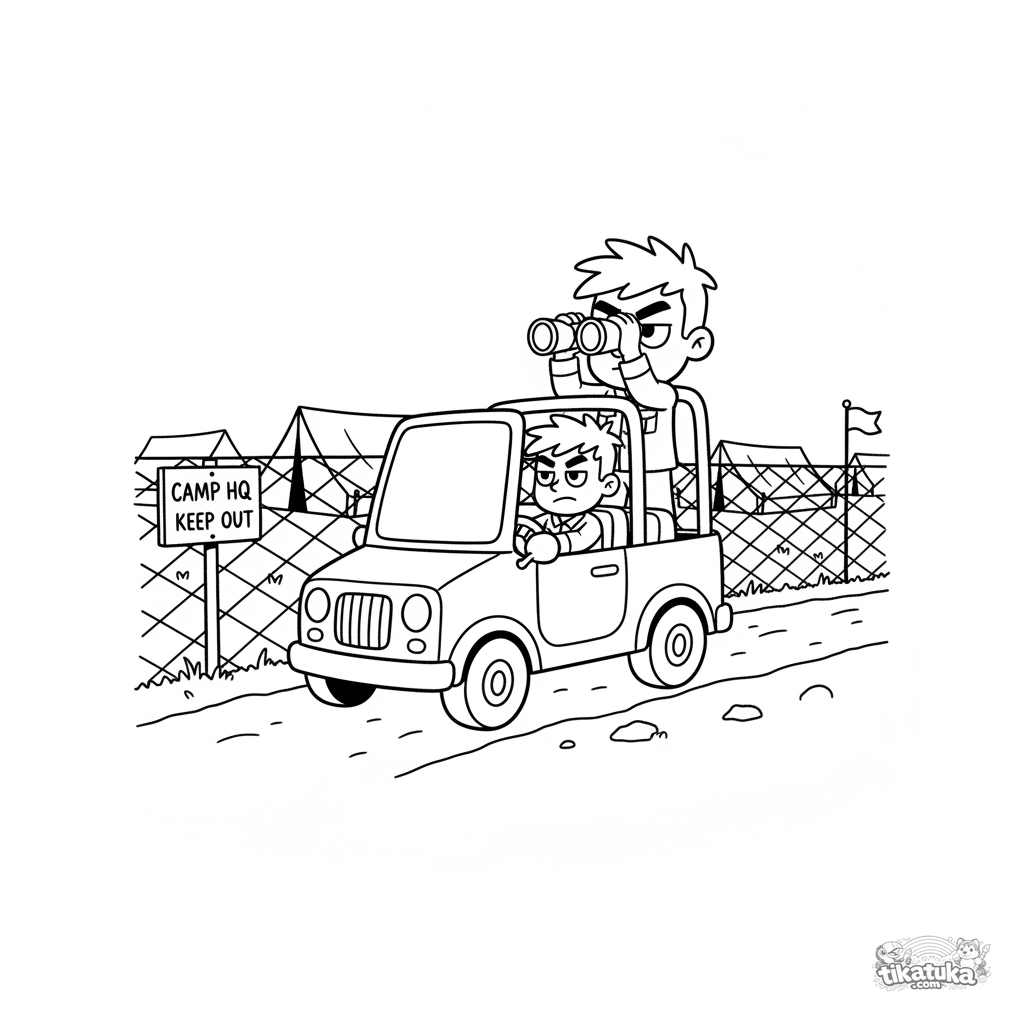 Página para colorir para 7-9 anos: um veículo militar leve patrulha o perímetro de um acampamento de quartel-general de campo. Um soldado dentro escaneia com binóculos.