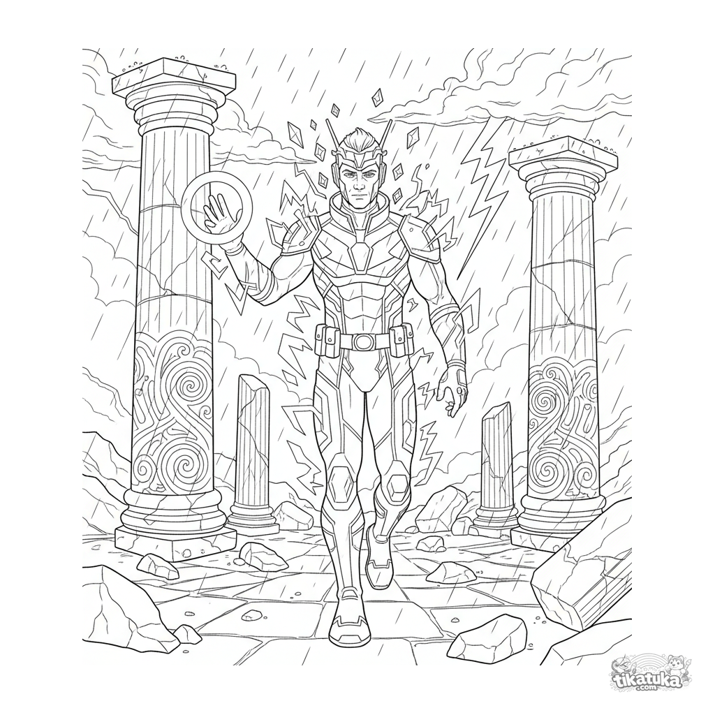 Página para colorir detalhada para crianças mais velhas 10-12: um herói relâmpago com aura elétrica investiga cautelosamente ruínas antigas tempestuosas.