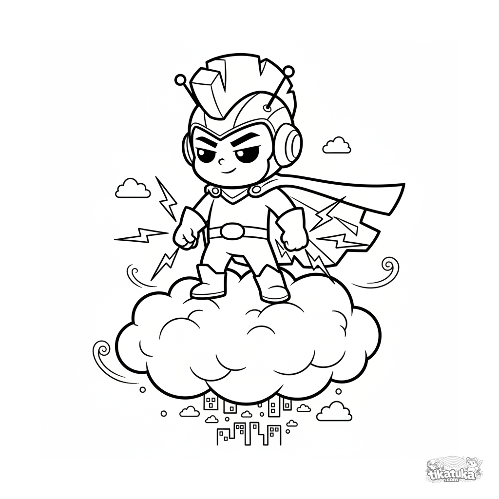 Página para colorir para 7-9 anos: um super-herói relâmpago em uma nuvem de tempestade, com faíscas elétricas saindo de suas mãos, olhando a cidade.