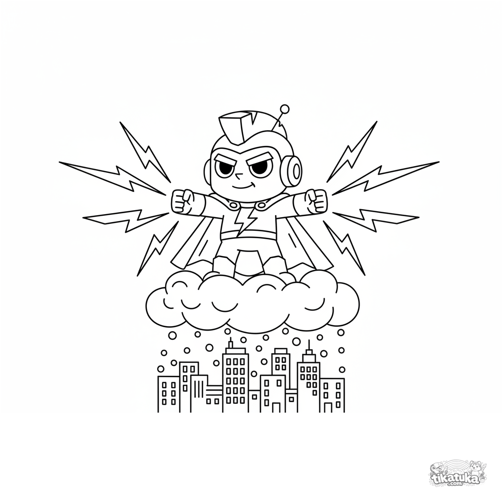Página para colorir de um super-herói relâmpago em uma nuvem de tempestade sobre uma cidade ao anoitecer. Para 7-9 anos. Cena dinâmica com linhas de energia e luzes da cidade.
