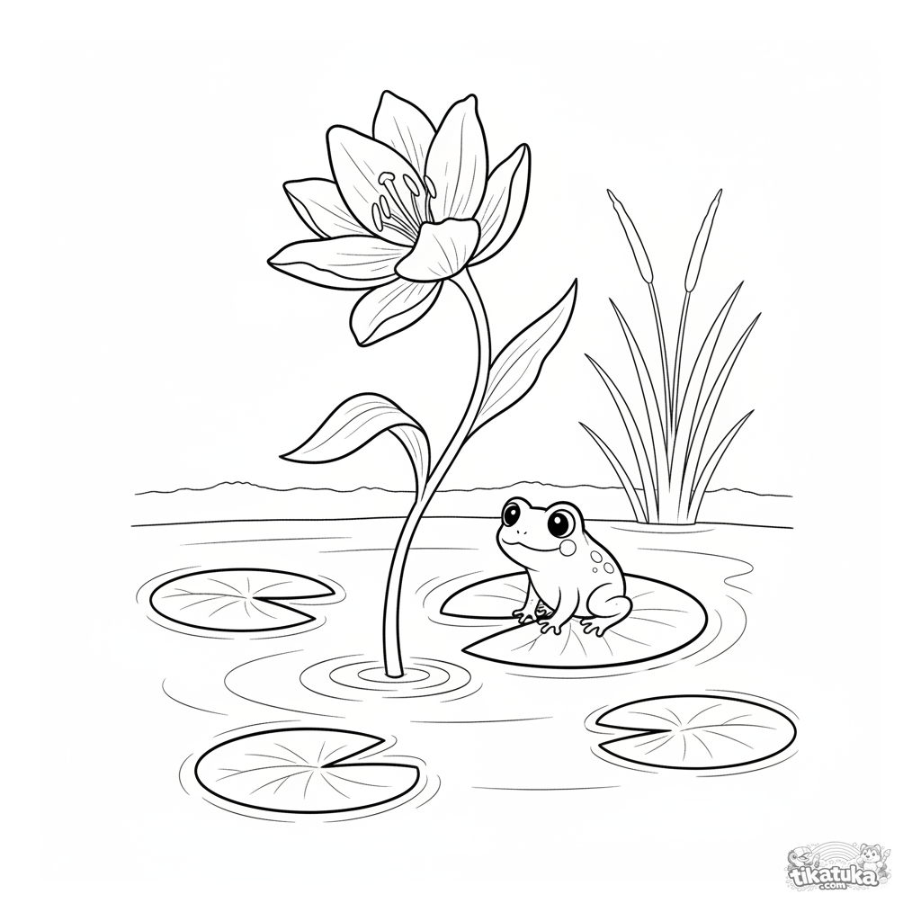 Página para colorir para crianças 4-6: um lírio flutua em um lago de jardim com um sapo curioso. Formas simples, cena serena.