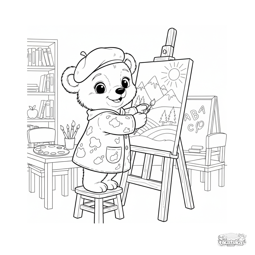 Página para colorir para pré-adolescentes 7-9: um ursinho artista com boina pinta uma paisagem em um cavalete ao lado do quadro na sala de aula.