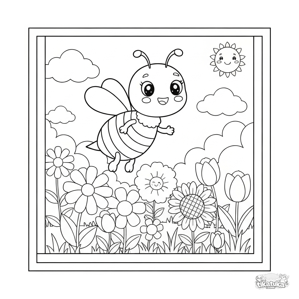 Uma alegre abelhinha voa entre flores brilhantes. Pinte o jardim ensolarado e ajude-a a coletar néctar!
