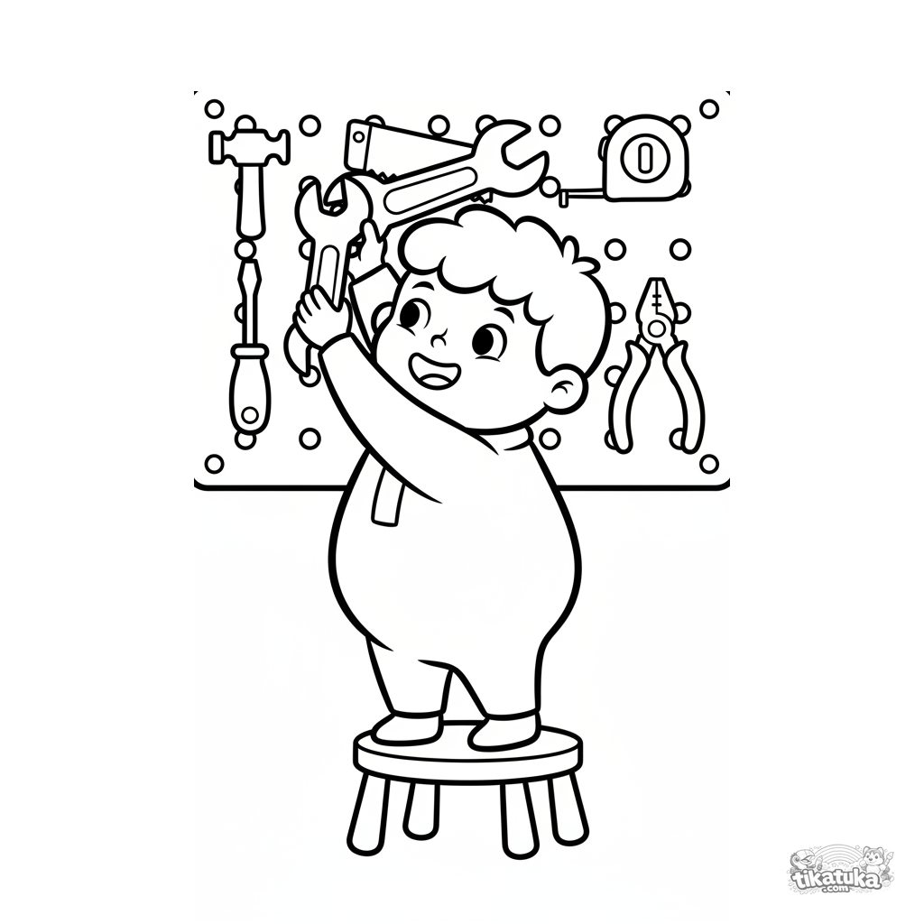 Página para colorir muito simples para crianças de 2-3 anos: um menino em um laboratório pendura ferramentas em uma parede. Formas grandes e reconhecíveis.
