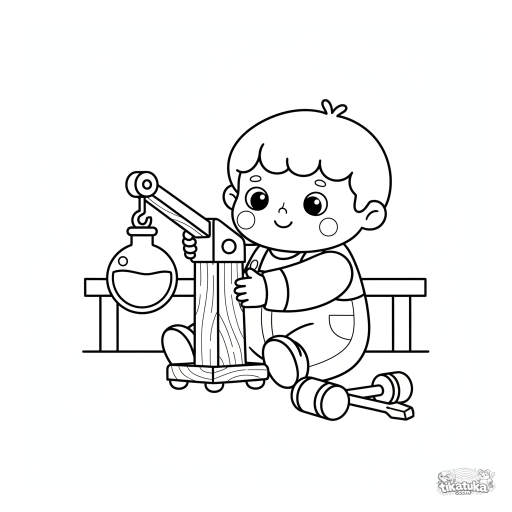 Página para colorir muito simples para crianças pequenas 2-3: um menino brinca com um guindaste de brinquedo no laboratório.