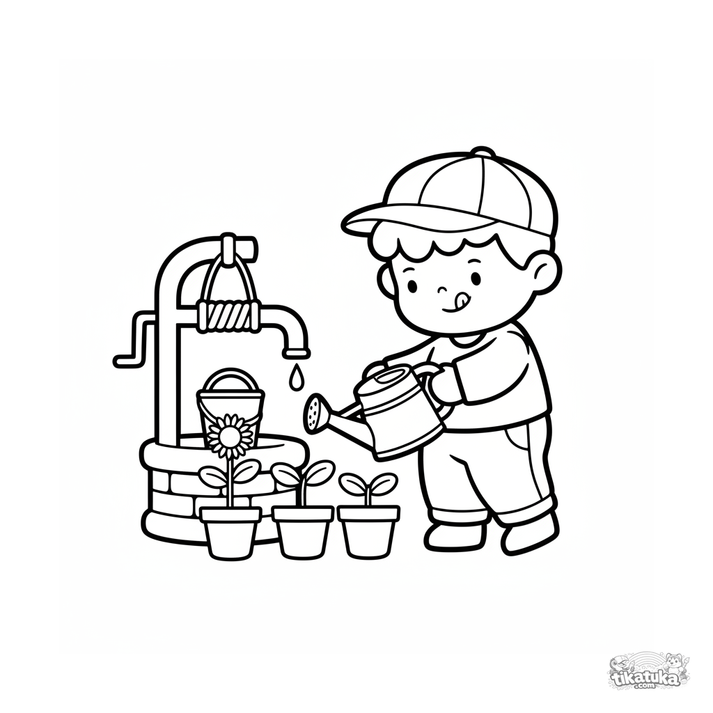 Página muito simples para colorir para crianças pequenas 2-3: um menino enche um regador no poço. Formas geométricas como de brinquedo de madeira, detalhes mínimos e contornos grossos.