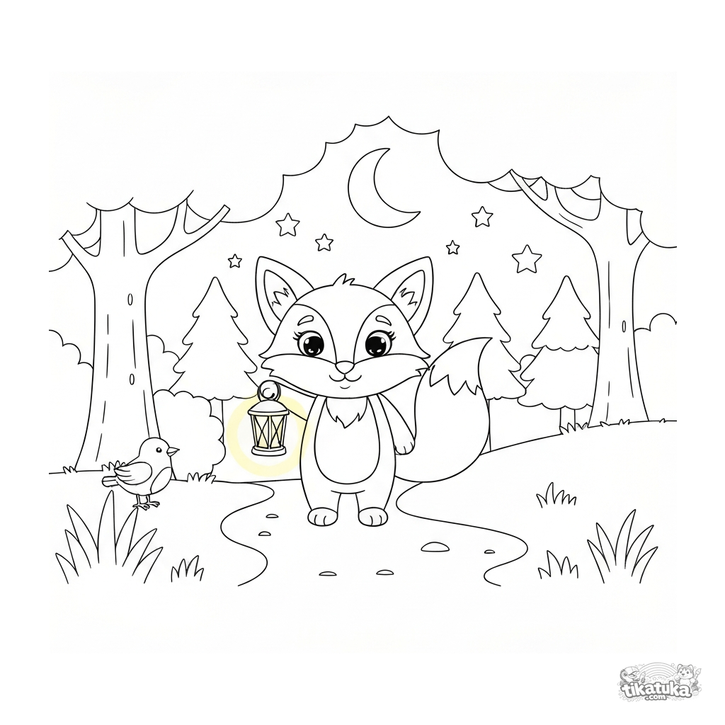 Um raposinho fofo anda pela floresta com uma lanterna. Pinte seu pelo vermelho, a lanterna brilhante e as estrelas no céu noturno!