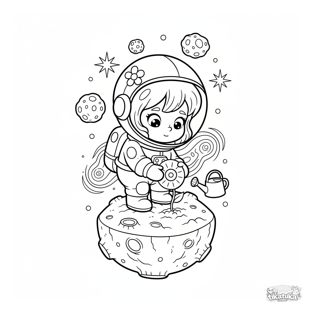 Página para colorir para meninas de 4-6 anos: uma menina astronauta com uma flor no capacete planta uma semente de flor cósmica em um asteroide.
