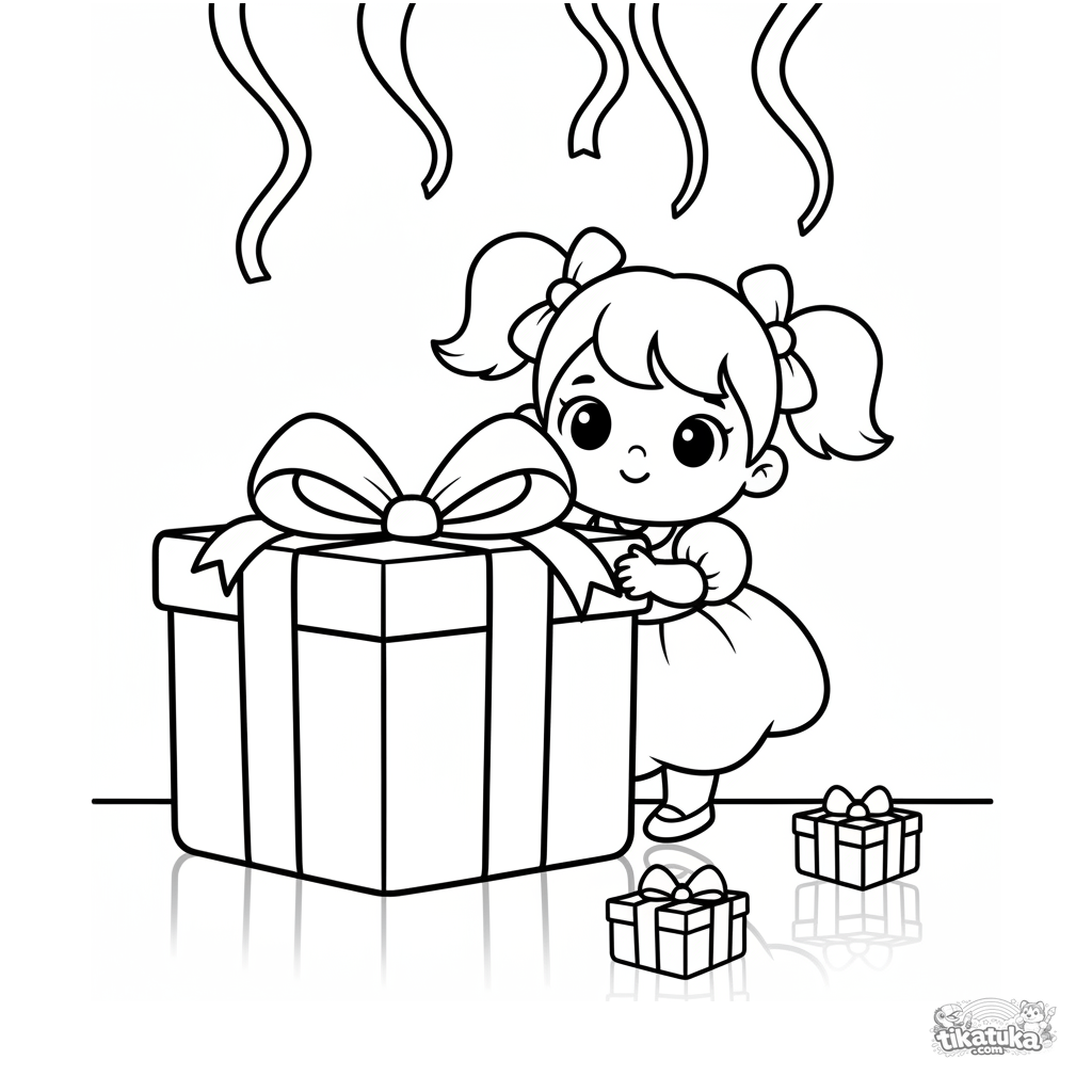 Página para colorir para crianças pequenas de 2-3 anos: uma menina com vestido fofo espreita atrás de um presente grande em um salão festivo. Formas grandes e simples.