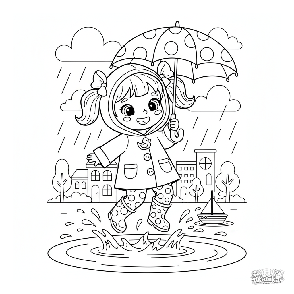 Página divertida para colorir para meninas de 4-6 anos: uma menina de capa de chuva salta numa poça debaixo de chuva. Uma cena brilhante e simples desenvolve a imaginação e a criatividade.