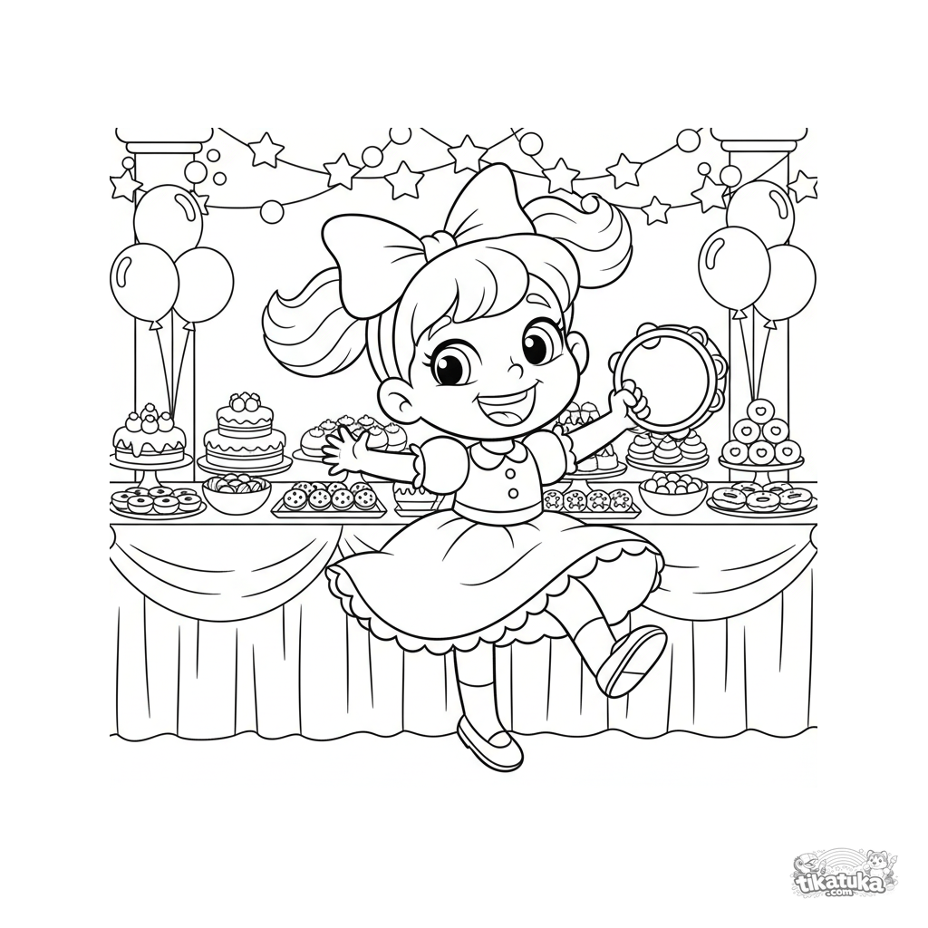 Página vibrante para colorir para crianças 4-6 anos: uma menina dança alegremente com um pandeiro perto de uma mesa de buffet. Cena dinâmica e feliz.