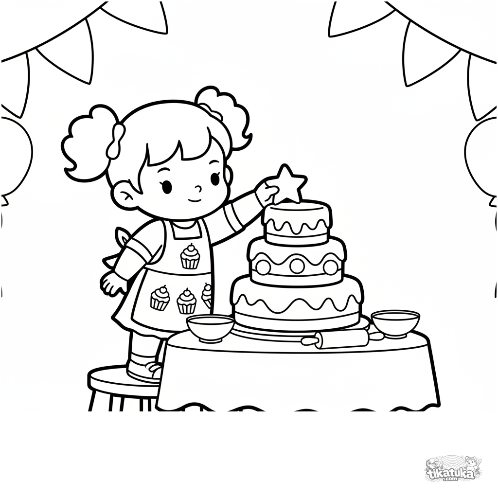 Página para colorir para crianças pequenas 2-3: uma menina pequena de avental decora um bolo de celebração em um salão de banquetes. Formas grandes e simples, poucos detalhes, margens amplas para colorir.