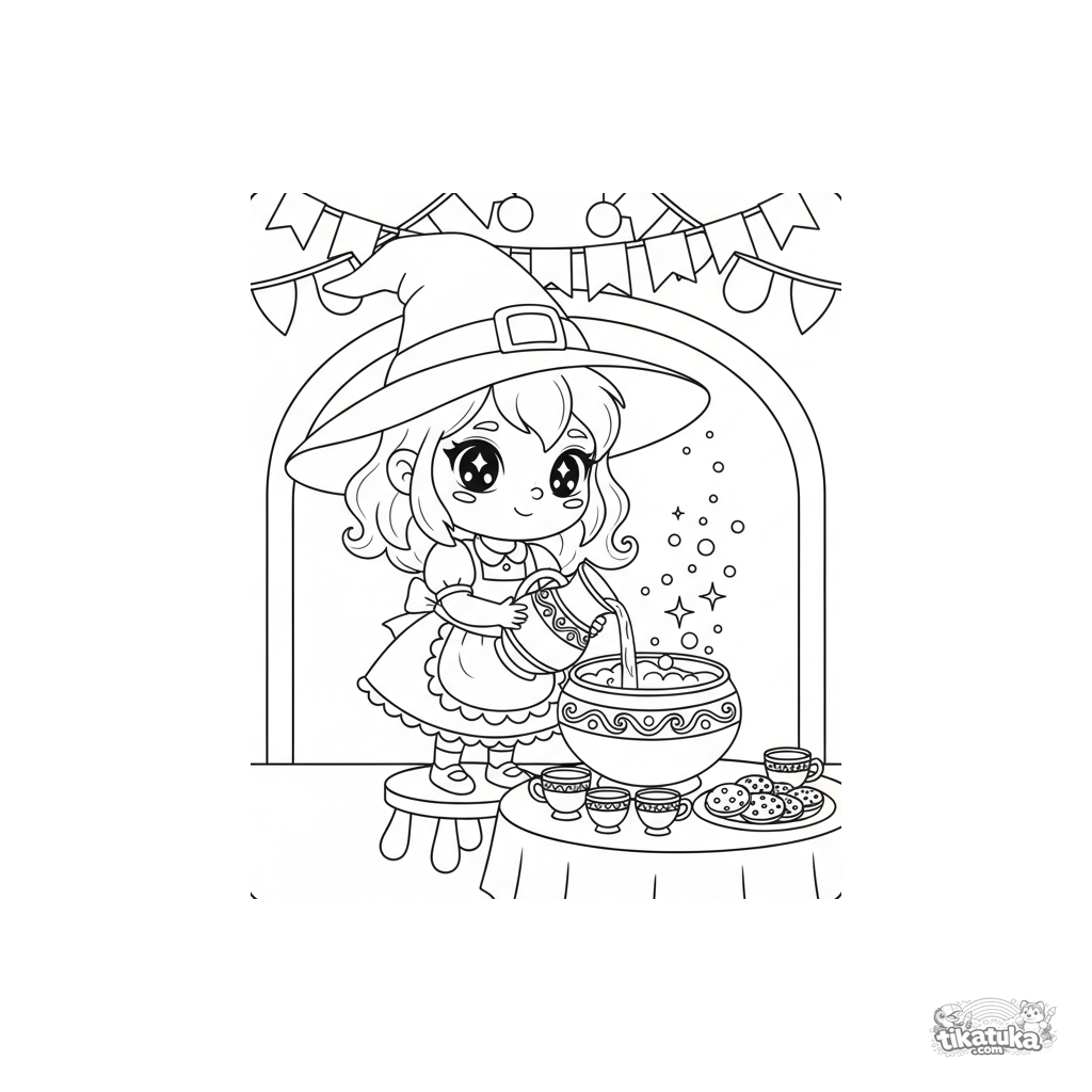 Página para colorir para crianças de 4 a 6 anos: uma bruxinha fofa prepara ponche mágico para uma festa. Personagem de fantasia e detalhes da mesa.