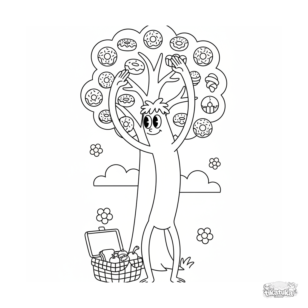 Página para colorir para crianças 7-9: um monstro de braços longos em estilo retro alcança uma árvore mágica de donuts em um piquenique. Cena dinâmica e fantástica.