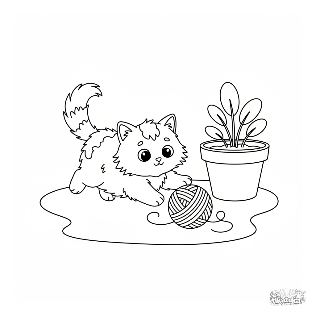 Página para colorir para crianças pequenas: um gatinho fofo persegue um novelo. Formas grandes e simples, perfeito para 2-3 anos.