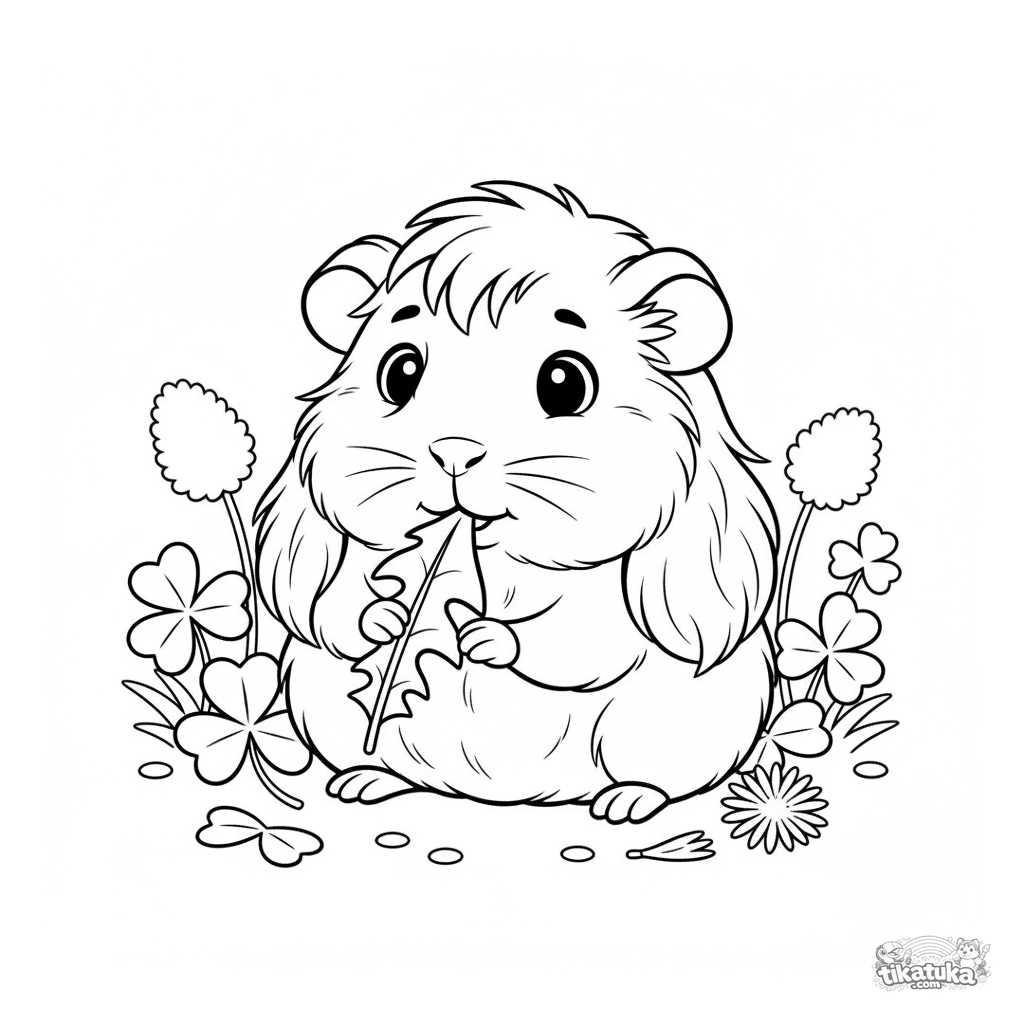 Página para colorir para crianças de 4-6 anos: um porquinho-da-índia fofo no trevo mordisca uma folha de dente-de-leão. Cena fofa e simples.