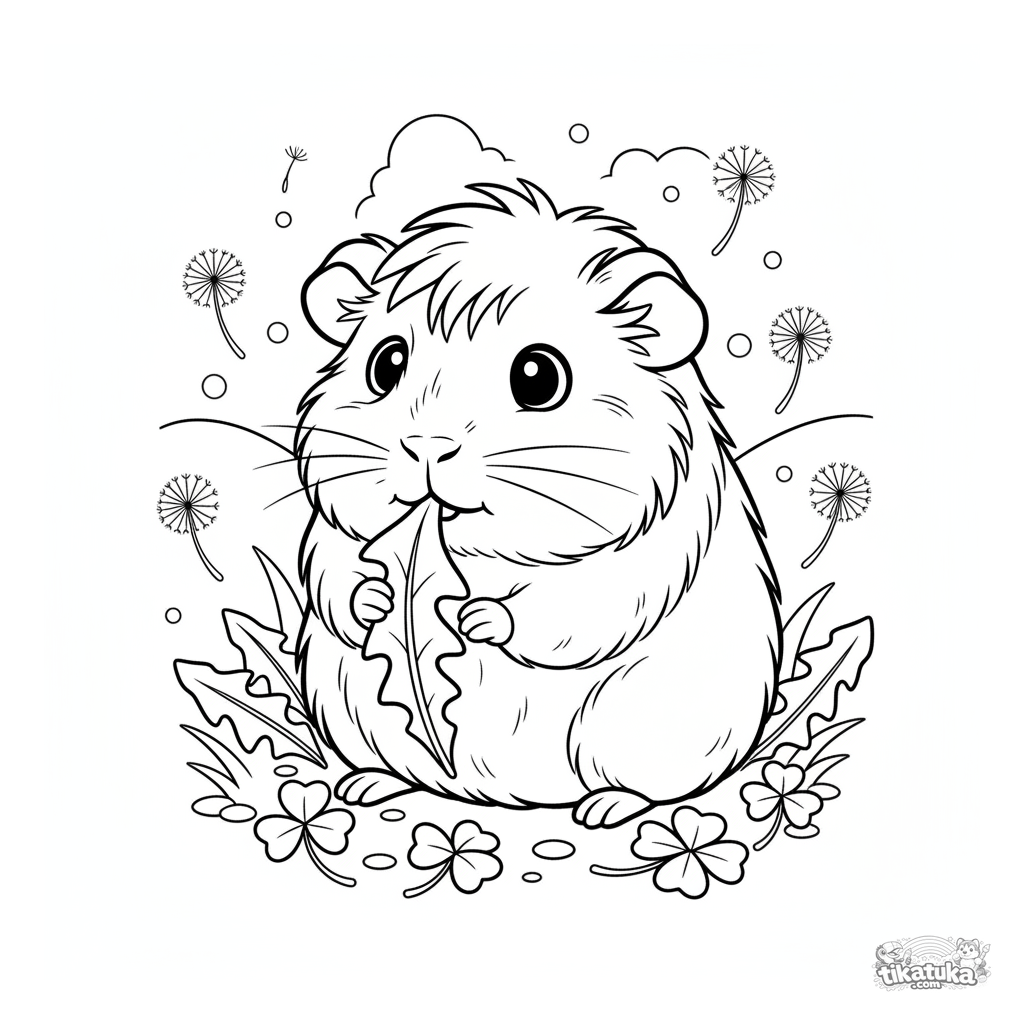 Página para colorir de um porquinho-da-índia fofo para crianças de 4 a 6 anos. O roedor de pelo comprido está sentado em um trevo, mastigando uma folha de dente-de-leão.