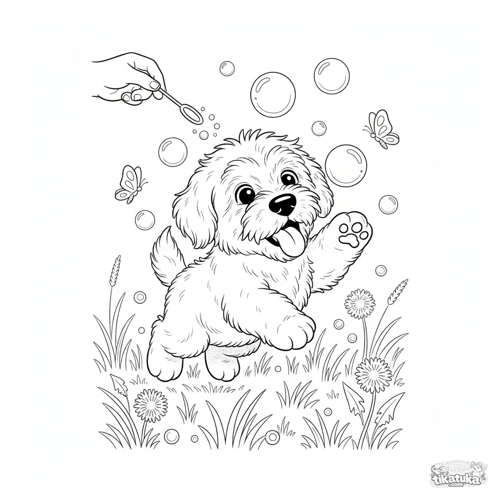 Página para colorir para crianças de 4-6 anos: um fofo filhote de pastor brinca alegre em um campo, perseguindo bolhas de sabão flutuantes. Formas simples e cena fofa.