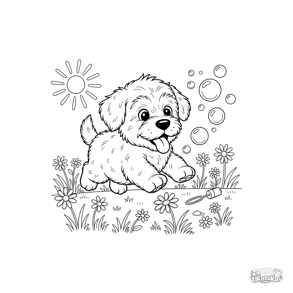 Página para colorir de um filhote fofo de Pastor perseguindo bolhas de sabão em um campo. Para crianças de 3 a 6 anos.