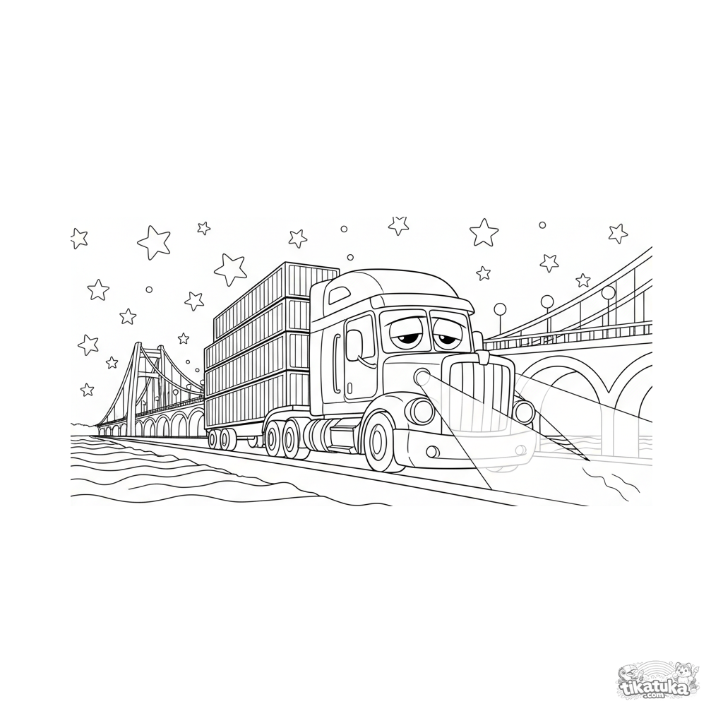 Página para colorir para crianças 7-9: um enorme caminhão trailer com contêineres cruza uma ponte iluminada sobre um rio à noite. Cena atmosférica estilo graphic novel.