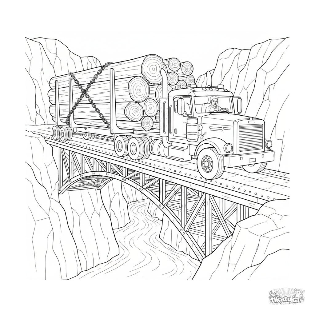 Página para colorir para crianças mais velhas 10-12: um caminhão de tora longo cruza com cuidado uma velha ponte de aço sobre um desfiladeiro.