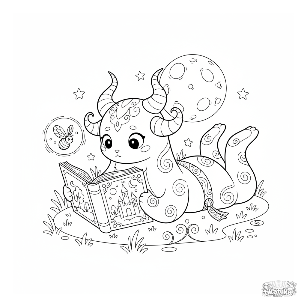 Página para colorir para crianças mais velhas de 7-12 anos: um monstro comprido com chifres encaracolados lendo um livro em um quintal iluminado pela lua.