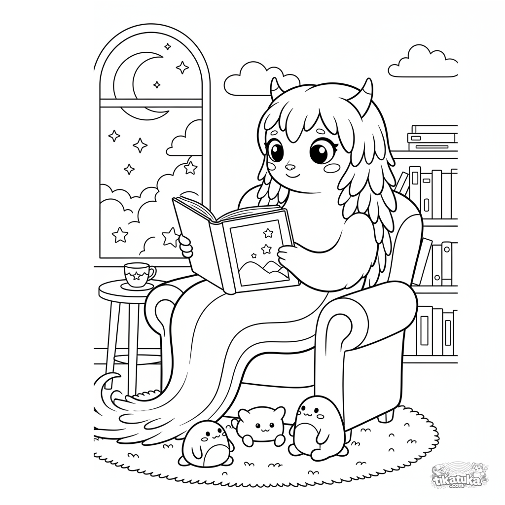Página para colorir para crianças 4-6: um monstro comprido com cabelo plumoso lê uma história para bichos de pelúcia em um quarto aconchegante iluminado pela lua. Cena tranquila.
