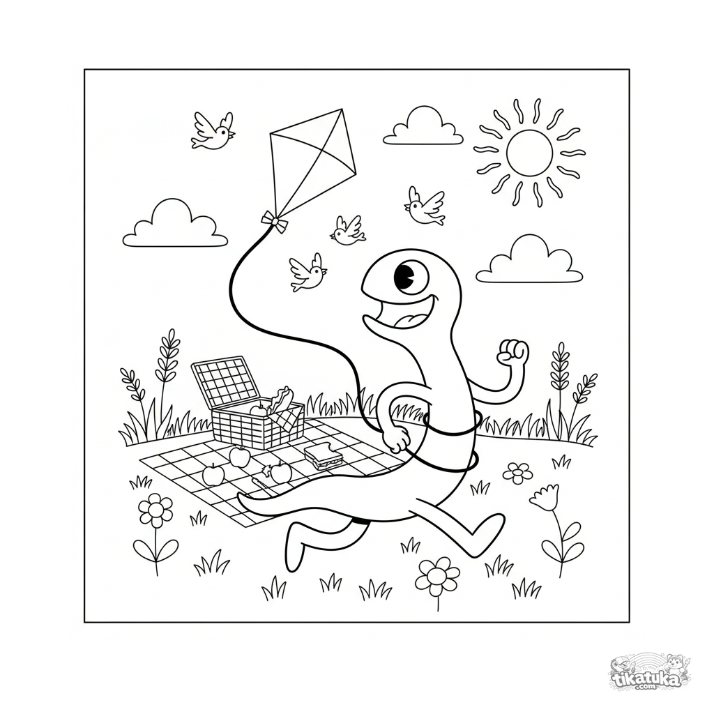 Página para colorir para crianças de 7-9 anos: um monstro longo corre alegremente por um campo soltando pipa em um piquenique. Cena de ação dinâmica e feliz.