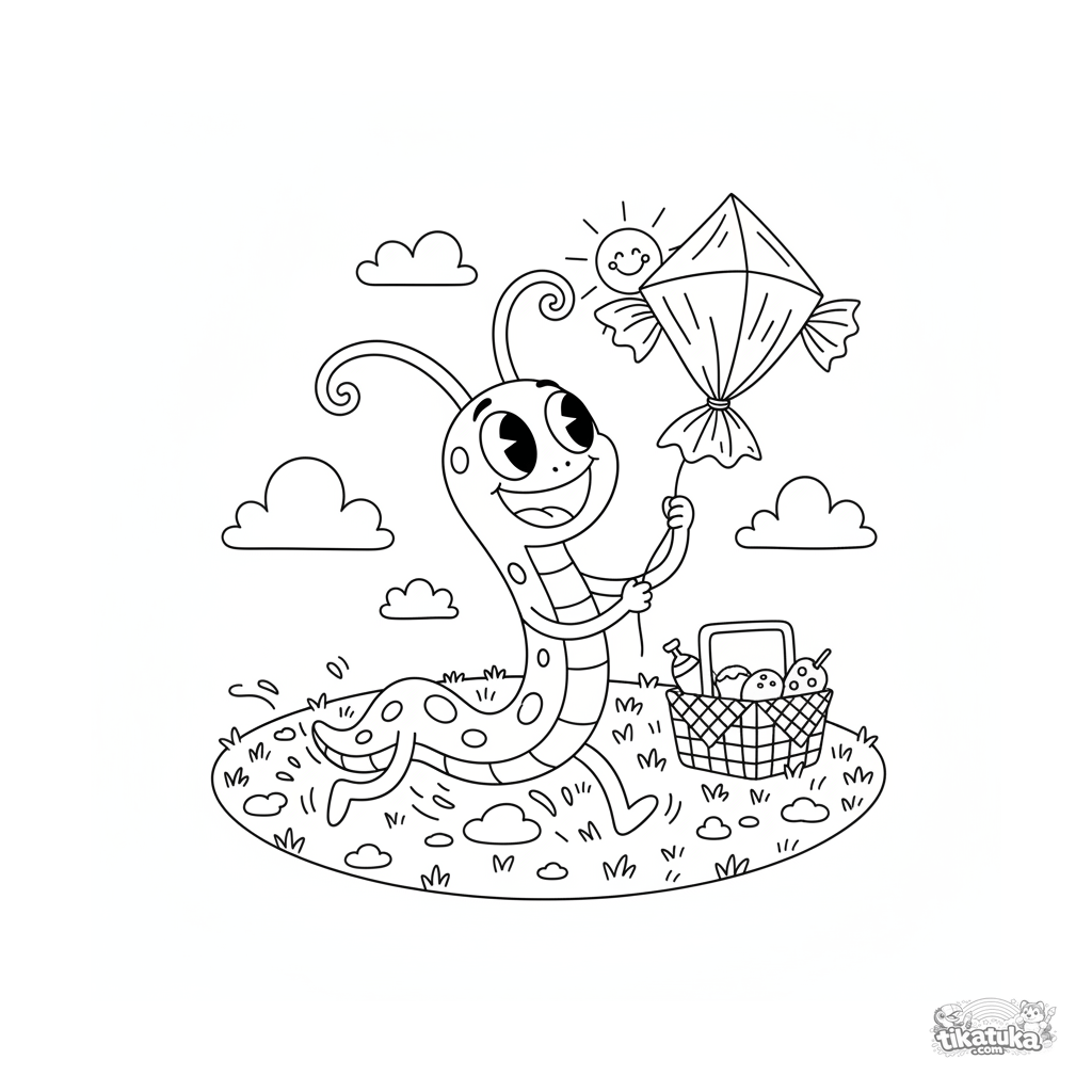 Página para colorir estilo retrô para pré-adolescentes de 7 a 9 anos: um monstro longo corre soltando uma pipa de embalagem de doce em um piquenique. Pose dinâmica.