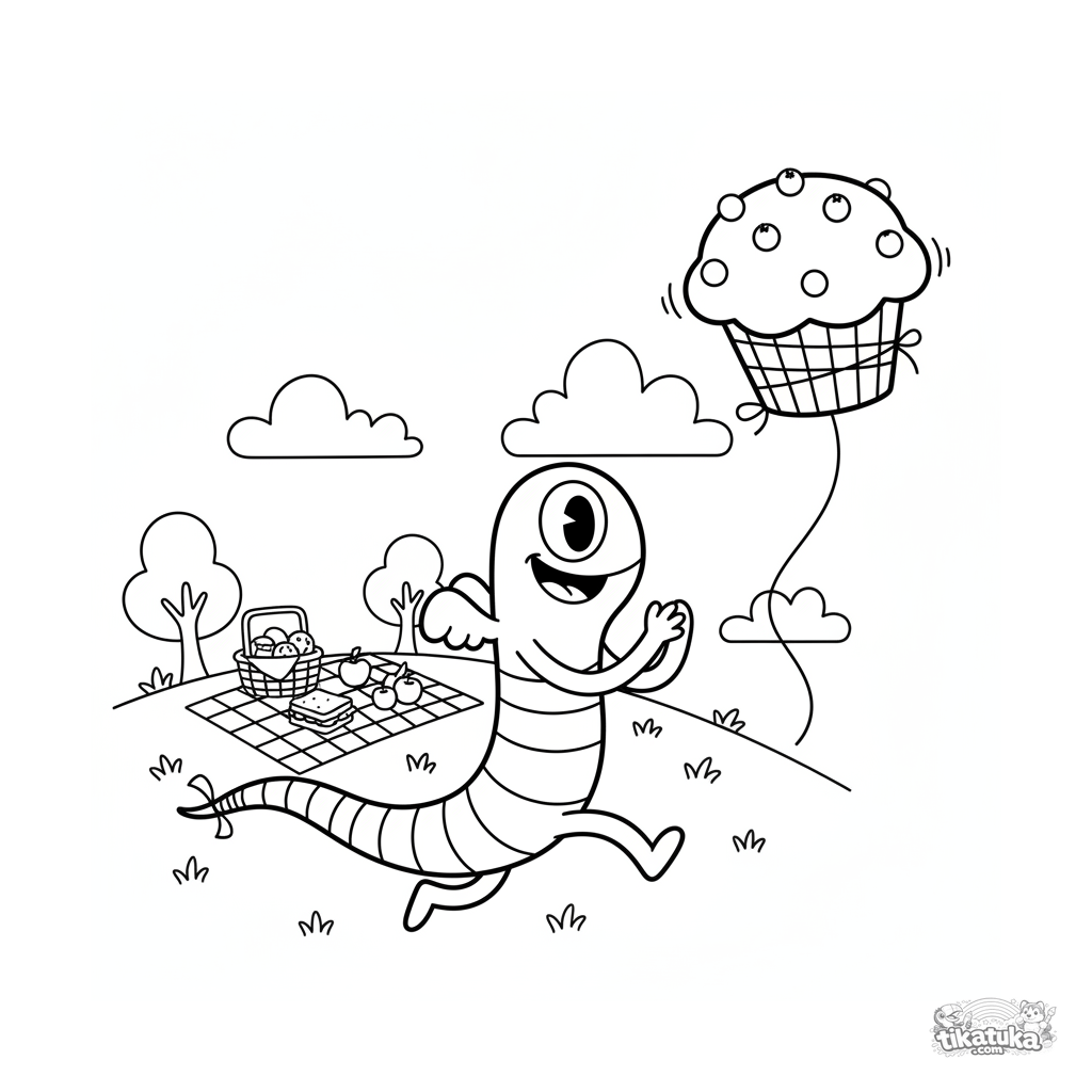 Página para colorir para crianças de 4-6 anos: um monstro longo e borrachudo solta uma pipa em forma de muffin de mirtilo em uma colina durante um piquenique. Cena retrô divertida, linhas simples.
