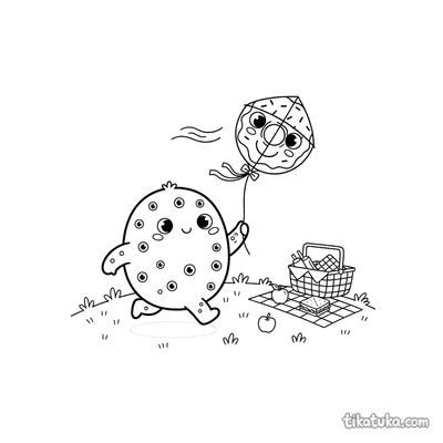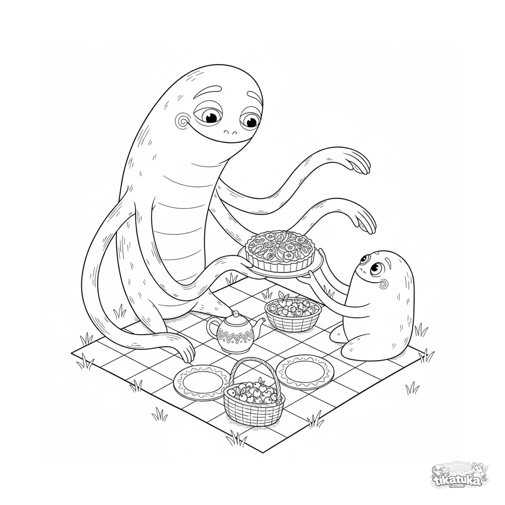 Página detalhada para colorir para crianças 10-12: um monstro comprido passando um prato de torta de frutas em um piquenique. Pose dinâmica, detalhes da comida.