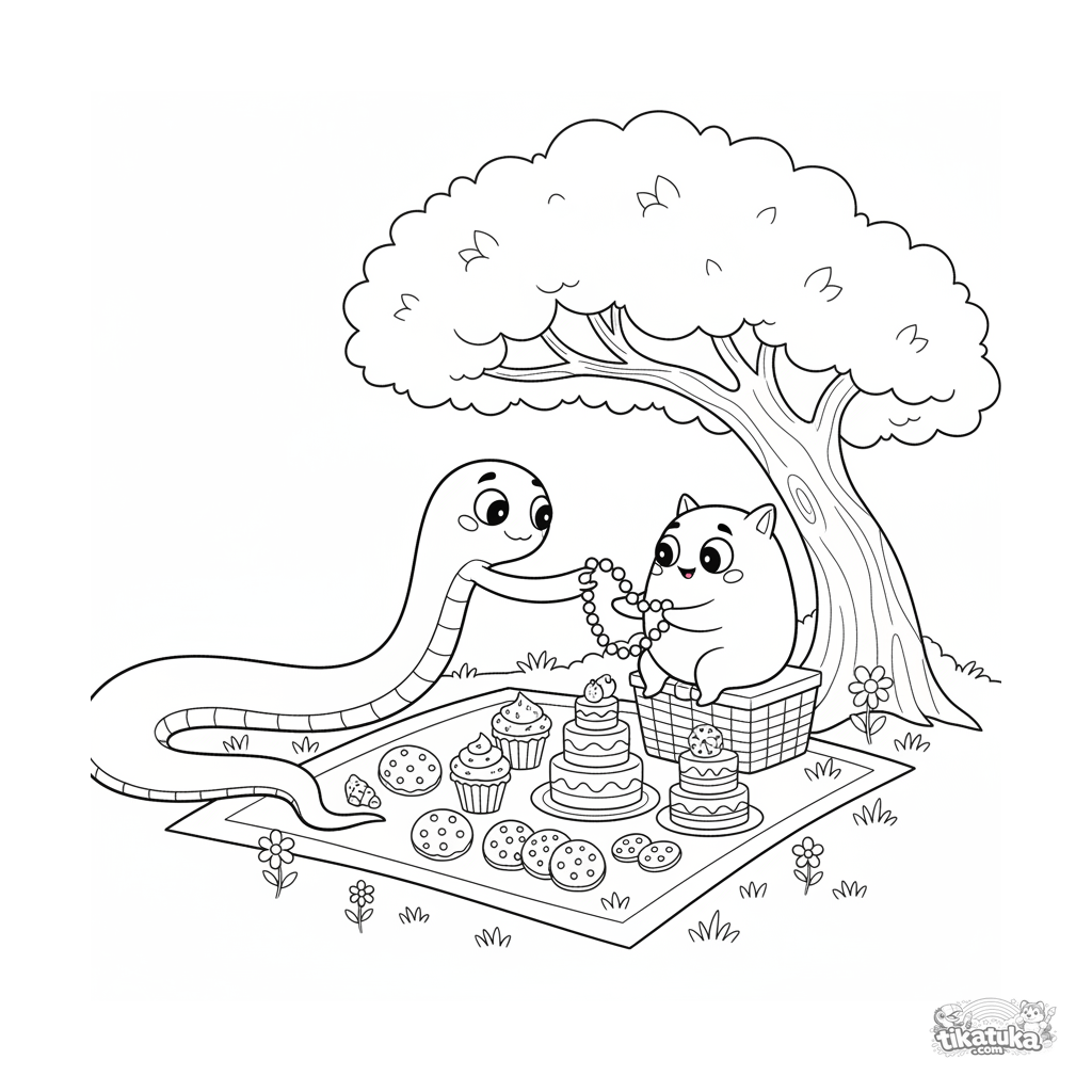 Página para colorir para crianças 4-6: um monstro longo e sonolento compartilha um colar de doce com um amigo pequeno em um piquenique sob uma árvore. Tema de amizade e guloseimas.