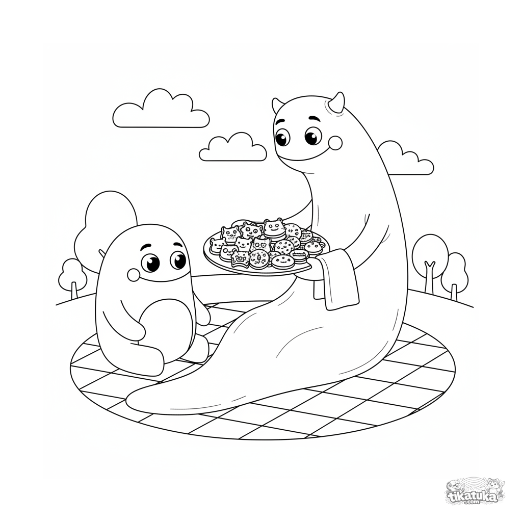 Página para colorir para 7-9 anos: um monstro comprido e gentil compartilha um prato de biscoitos em forma de monstro com um amigo em um piquenique. Cena sobre amizade.