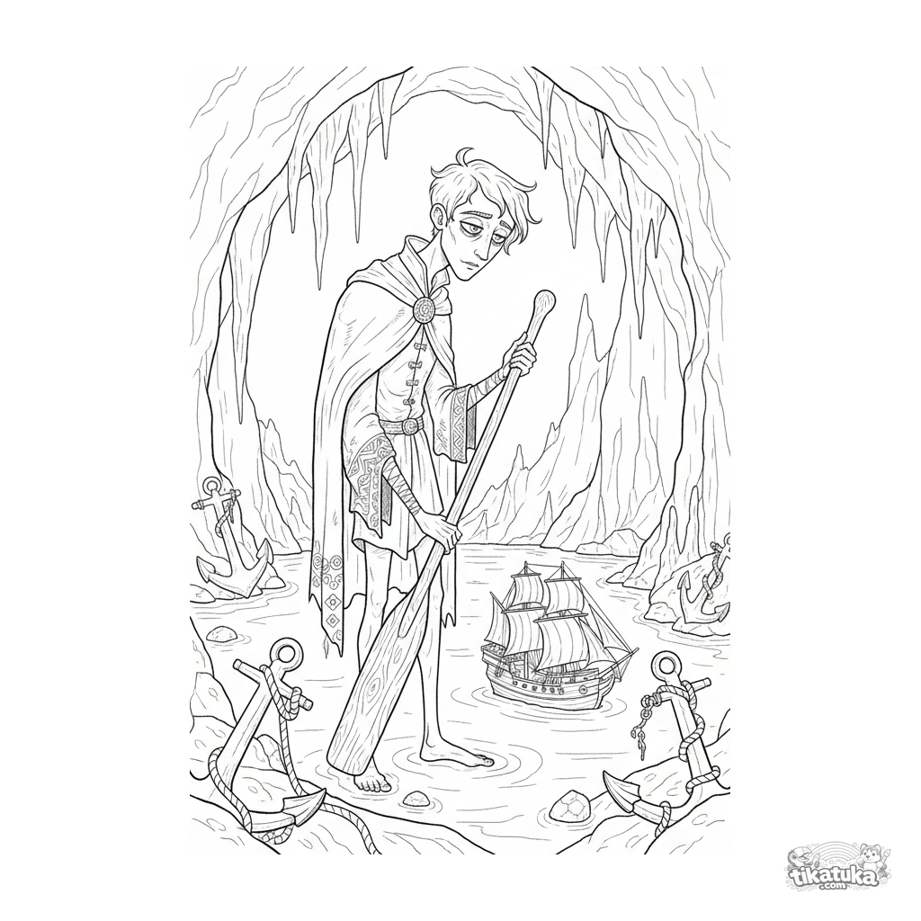 Página atmosférica detalhada para 10-12: o fantasma de um antigo marinheiro junto a um lago subterrâneo no covil da Medusa. Estilo esboço aquarela.