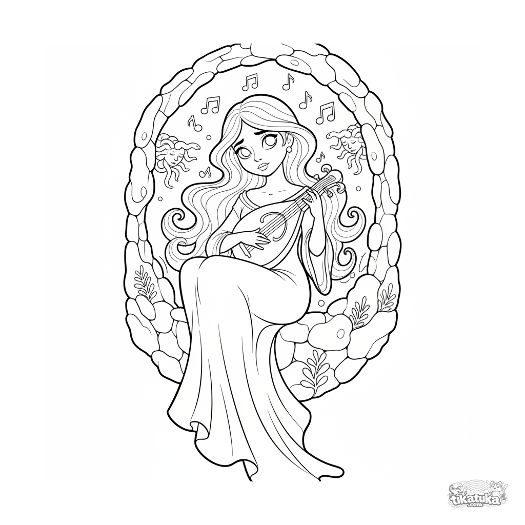 Página para colorir para crianças de 7-9 anos: uma musa com uma lira em um nicho aconchegante do covil da Górgona.
