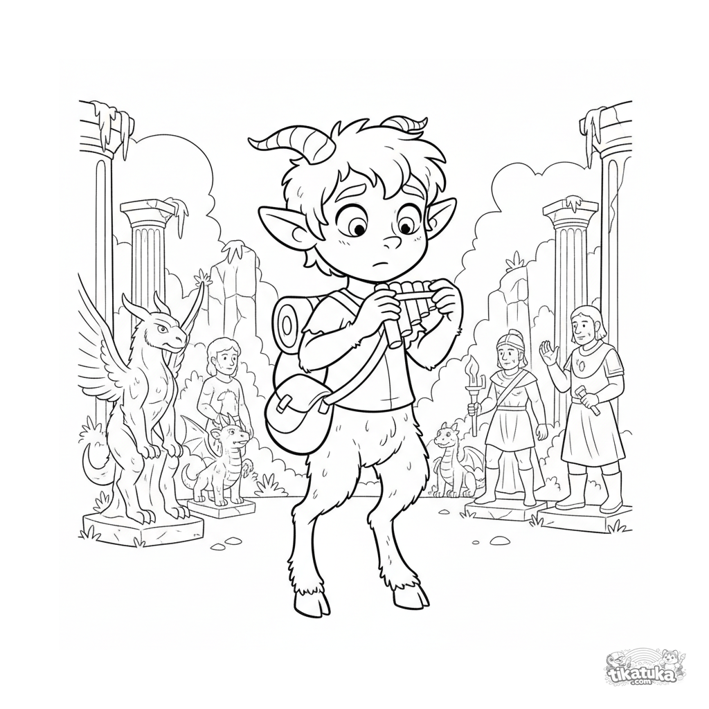 Página para colorir para crianças de 4-6 anos: um sátiro músico perdido no covil da Medusa tocando para estátuas de pedra.