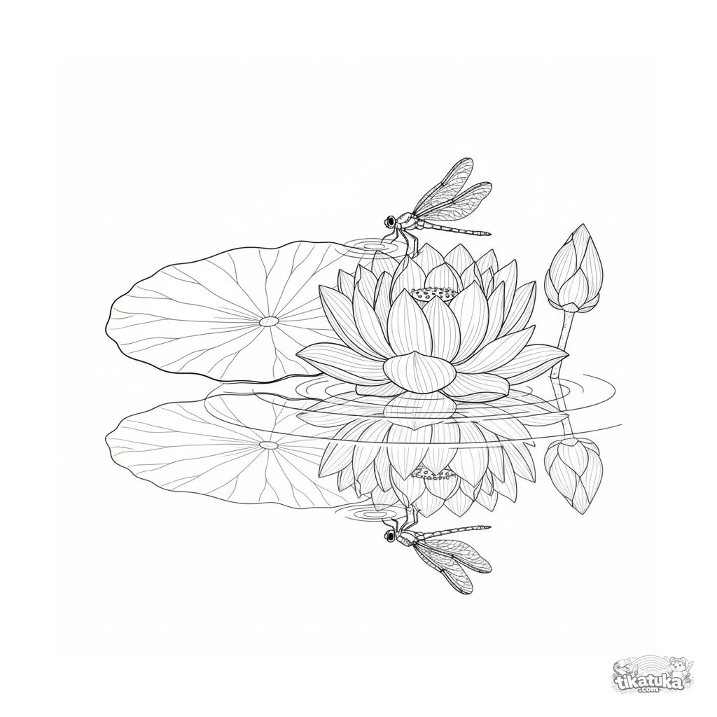 Página para colorir detalhada para 10-12 anos: uma flor de lótus flutua em um lago, uma libélula pousando nela. Cena natural tranquila.