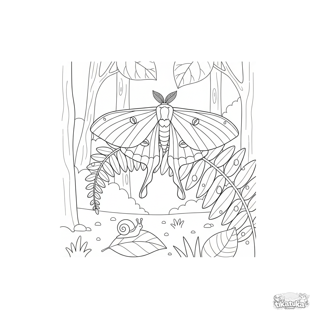 Página para colorir para crianças: uma linda mariposa lunar com asas padronizadas descansando numa samambaia. Para 4-6 anos.