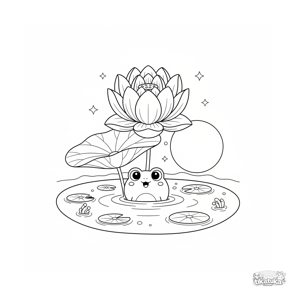Página para colorir para pré-adolescentes: um lótus mágico gigante flutua em uma lagoa ao luar, com um sapinho espiando. Cena encantada, detalhes moderados.