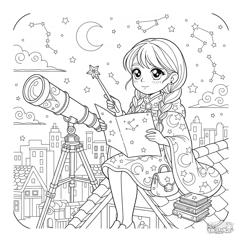 Página para colorir estilo anime kodomo: uma garota mágica estuda as estrelas do telhado da cidade. Cena única com telescópio e mapa estelar para 10-12 anos.