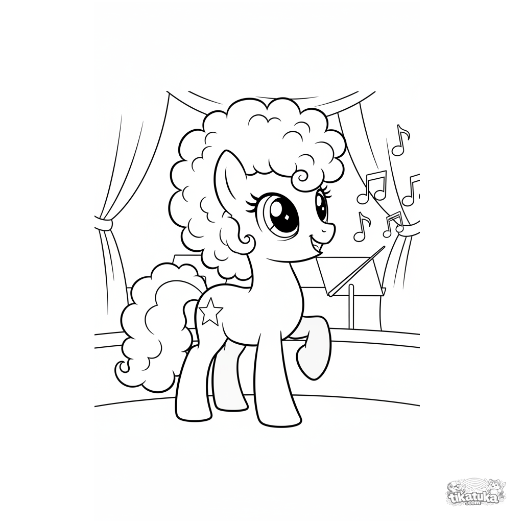 Página para colorir para crianças 7-9: um pônei mágico maestro fica no fosso da orquestra diante do palco, criando notas mágicas com sua batuta.